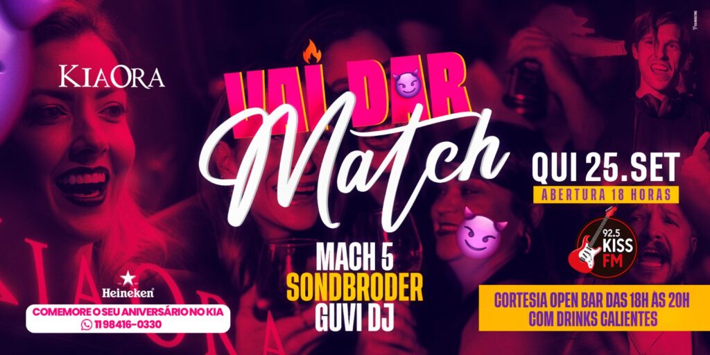 E é pensando nesse público que o Kia Ora traz mais uma edição da sua festa “Vai Dar Match” nessa quinta-feira, dia 25 de setembro. Em uma atmosfera que mistura diversão e autenticidade, as pessoas poderão curtir uma noite de muita música, drinks elaborados (ou a velha e boa cerveja), conhecer gente animada e, por que não, engatar um relacionamento para engrossar a pesquisa como mais um casal no país?