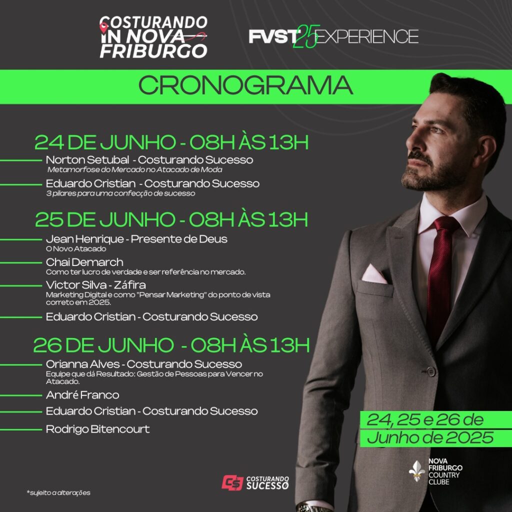 Com uma programação especialmente elaborada para fomentar o conhecimento, o networking e o desenvolvimento de negócios, o fórum abordará temas estratégicos como inovação, gestão, empreendedorismo e tendências do mercado têxtil. Os participantes poderão adquirir ingressos individuais para cada dia ou optar pelo pacote completo para os três dias, com valor promocional.