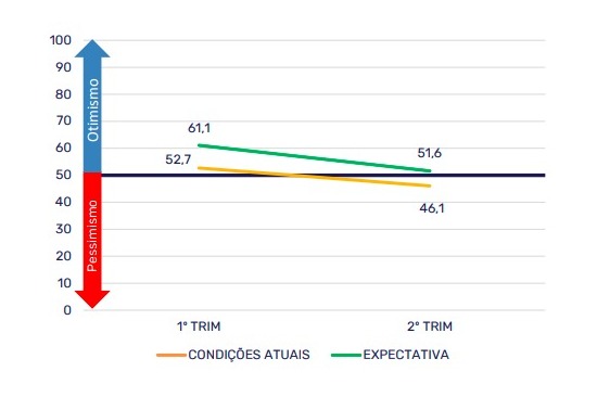 Ao detalhar os dados, o índice revela que a confiança em relação às condições atuais caiu de 52,7 para 46,1 pontos, já em patamar pessimista. Por outro lado, a percepção sobre as expectativas para os próximos seis meses recuou de 61,1 para 51,6 pontos, mas permaneceu em território otimista – sinalizando confiança na recuperação futura.