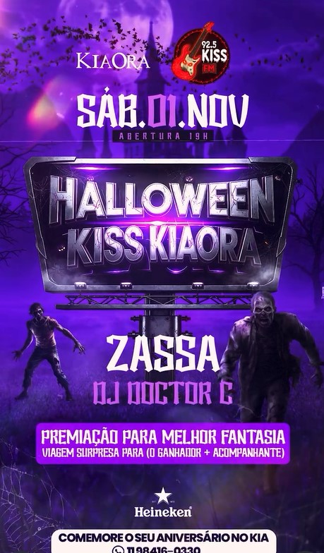 No dia 1º de novembro, a partir das 19h, o Kia Ora, em uma parceria com a Kiss FM, se transforma em um verdadeiro portal para o mundo dos mortos. A tradicional casa noturna paulistana promete uma das noites mais intensas do ano com sua festa de Halloween, marcada por música, performances e uma atmosfera de puro terror.