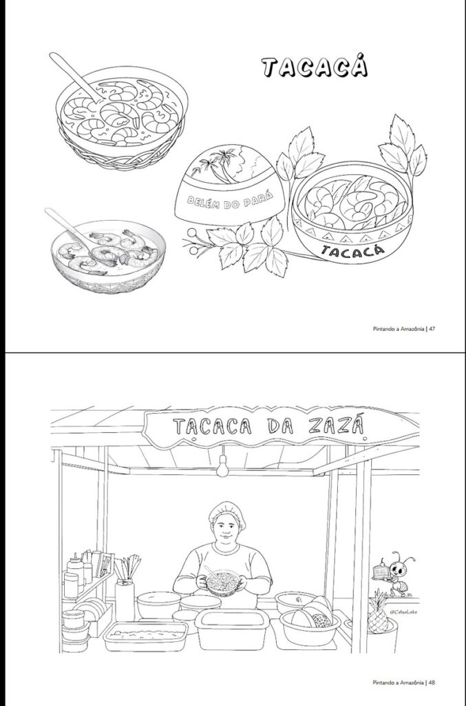 Gastronomia paraense: pratos típicos como tacacá, maniçoba e açaí surgem em traços prontos para ganhar cores e despertar memórias afetivas.